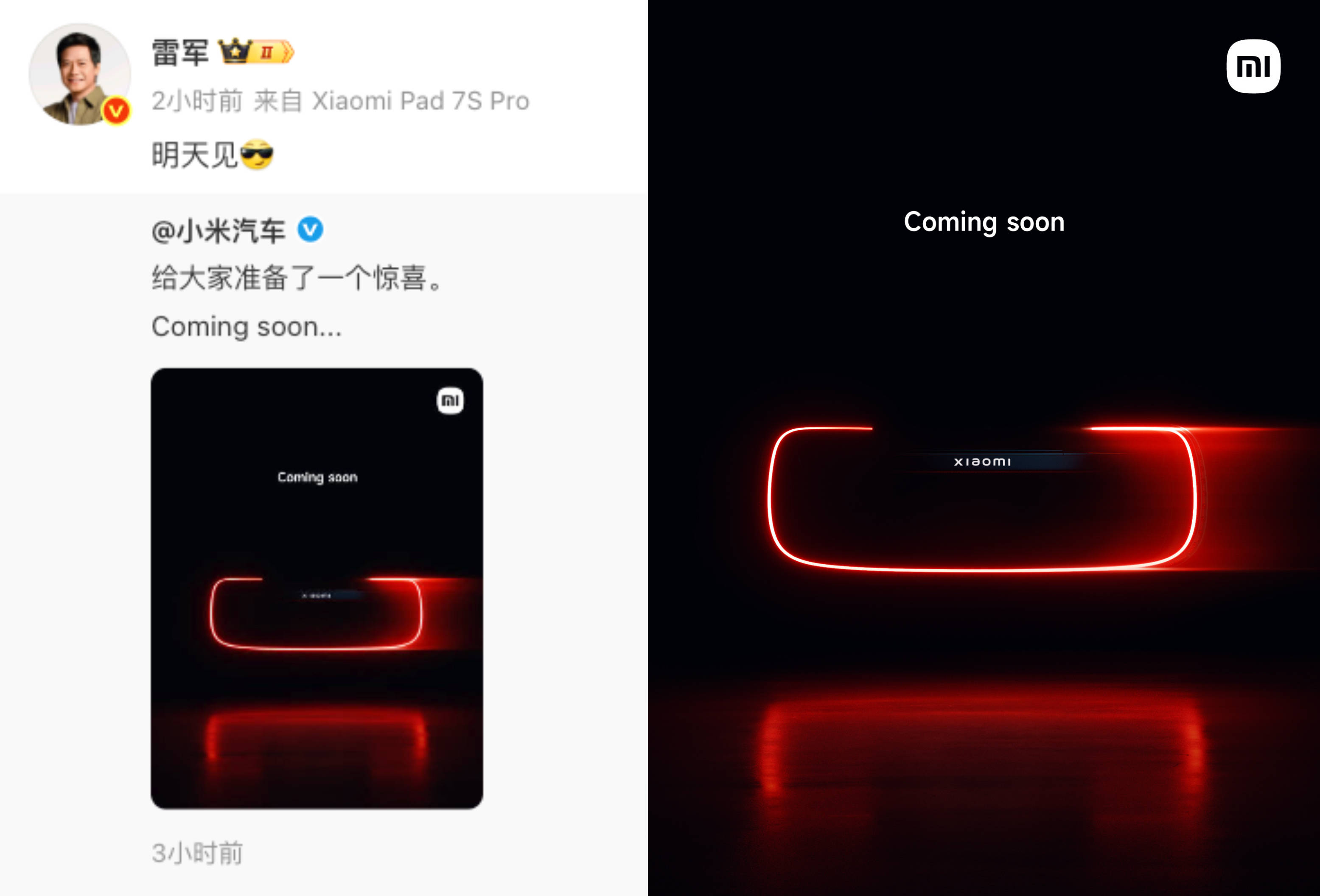 今日一早,小米汽車突然發布預熱海報,宣布新車即將登場,雷軍在海報下方留言“明天見”,瞬間引發廣泛關注與熱議。海報中透露的信息有限,僅展示了一組獨特的圓弧形燈以及“xiaomi”的logo。不過,從燈光與地面極近的距離來看,這顯然不是傳統家用車或SUV的風格,結合個性的燈光設計,有猜測認為這可能是一款低趴的跑車。