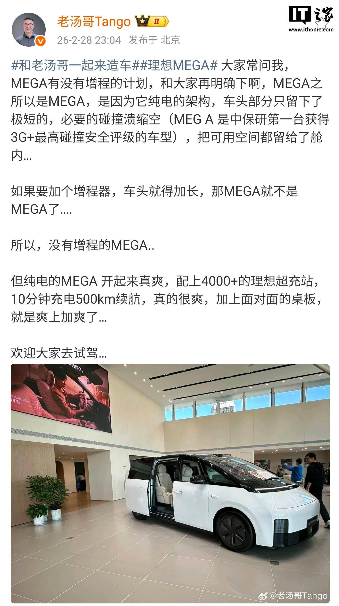 理想汽車產品線負責人湯靖近日明確表示,旗下純電MPV車型理想MEGA將不會推出增程版本。據介紹,MEGA基于純電架構打造,車頭設計僅保留了極短的必要碰撞潰縮空間,最大限度優化了艙內可用空間。若增加增程器,車頭長度將被迫延長,這將改變車型的核心設計理念,因此官方最終決定保持純電版本不變。
