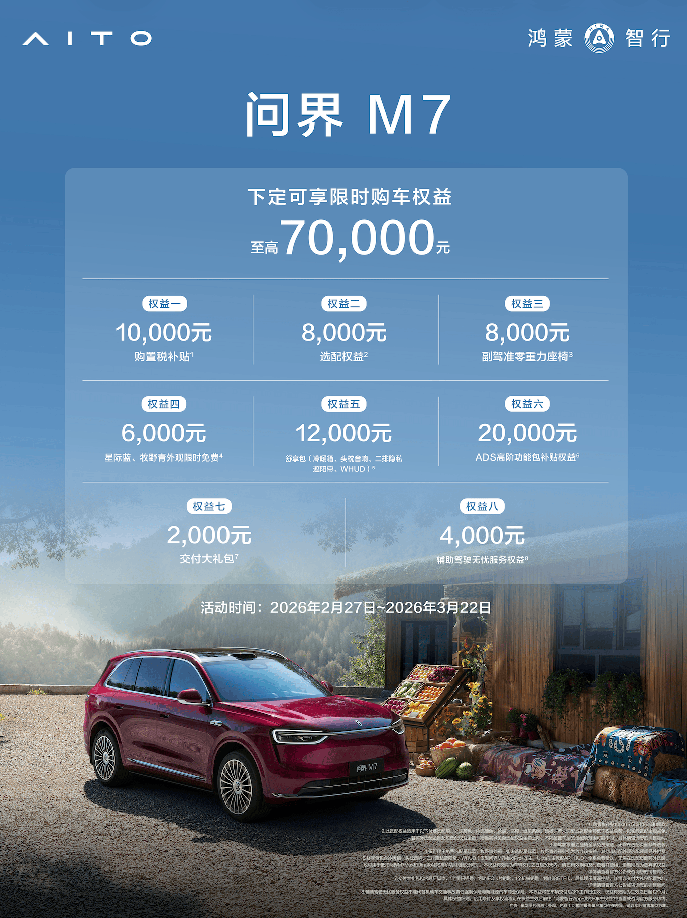 問界近日宣布推出一項限時專屬購車權益,為消費者帶來重磅優惠。自即日起至3月22日,下定問界M7的客戶可享受最高達70,000元的購車禮遇,涵蓋多項增值服務與現金補貼,進一步降低購車門檻。