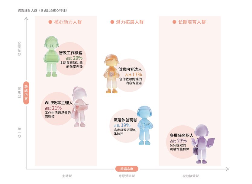 白皮書精準刻畫了五大跨端核心人群,他們的需求共同指向了對“無縫體驗”的渴望。作為效率先鋒的 “智效工作極客”,其中95%的用戶幾乎每日跨端,他們主動探索各類工具,卻常被應用不兼容、功能受限所困擾。追求工作與生活平衡的 “WLB效率主理人”,85%每日跨端,她們期待流程順暢,任何操作卡頓都會直接影響使用意愿。年輕的“創意內容達人”已將跨端協作作為創作習慣,體驗割裂會嚴重削弱其創作效率。而“沉浸體驗玩咖”則渴望將手游的樂趣延伸至PC大屏,獲取更極致的沉浸感。