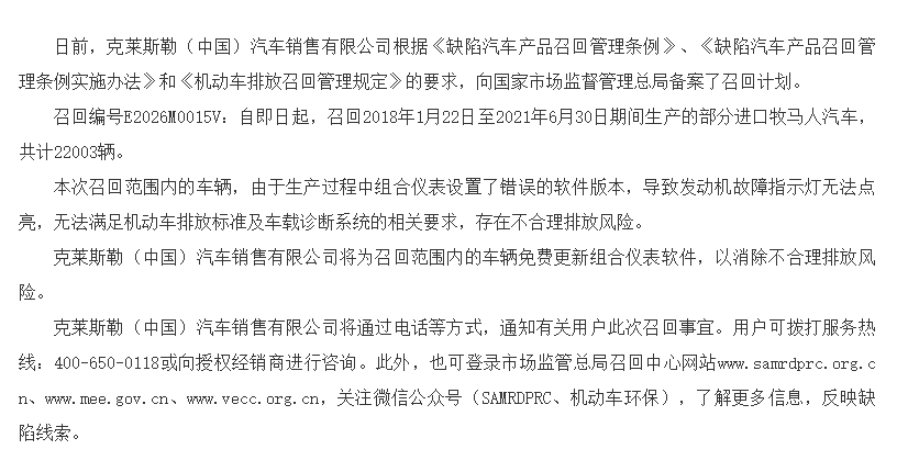 克萊斯勒(中國)汽車銷售有限公司也宣布召回部分進口牧馬人汽車。召回范圍包括特定生產批次的車輛,這些車輛在制造過程中可能存在某些不符合安全標準的情況。克萊斯勒方面將積極與車主聯系,安排召回維修事宜,以保障消費者的權益。