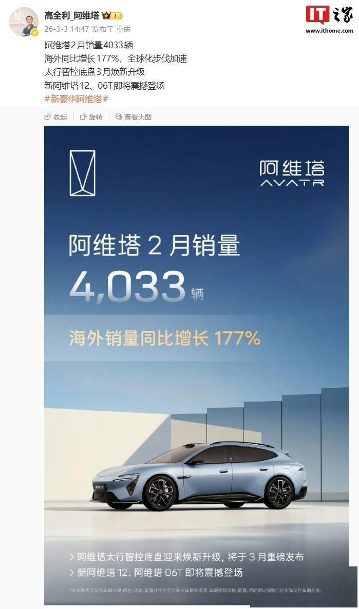 阿維塔近日公布了最新市場動態與產品規劃。數據顯示,該品牌2月銷量達到4033輛,海外市場同比增長177%,全球化布局持續深化。這一成績的取得,既得益于現有產品的市場表現,也離不開即將推出的新品與技術升級。
