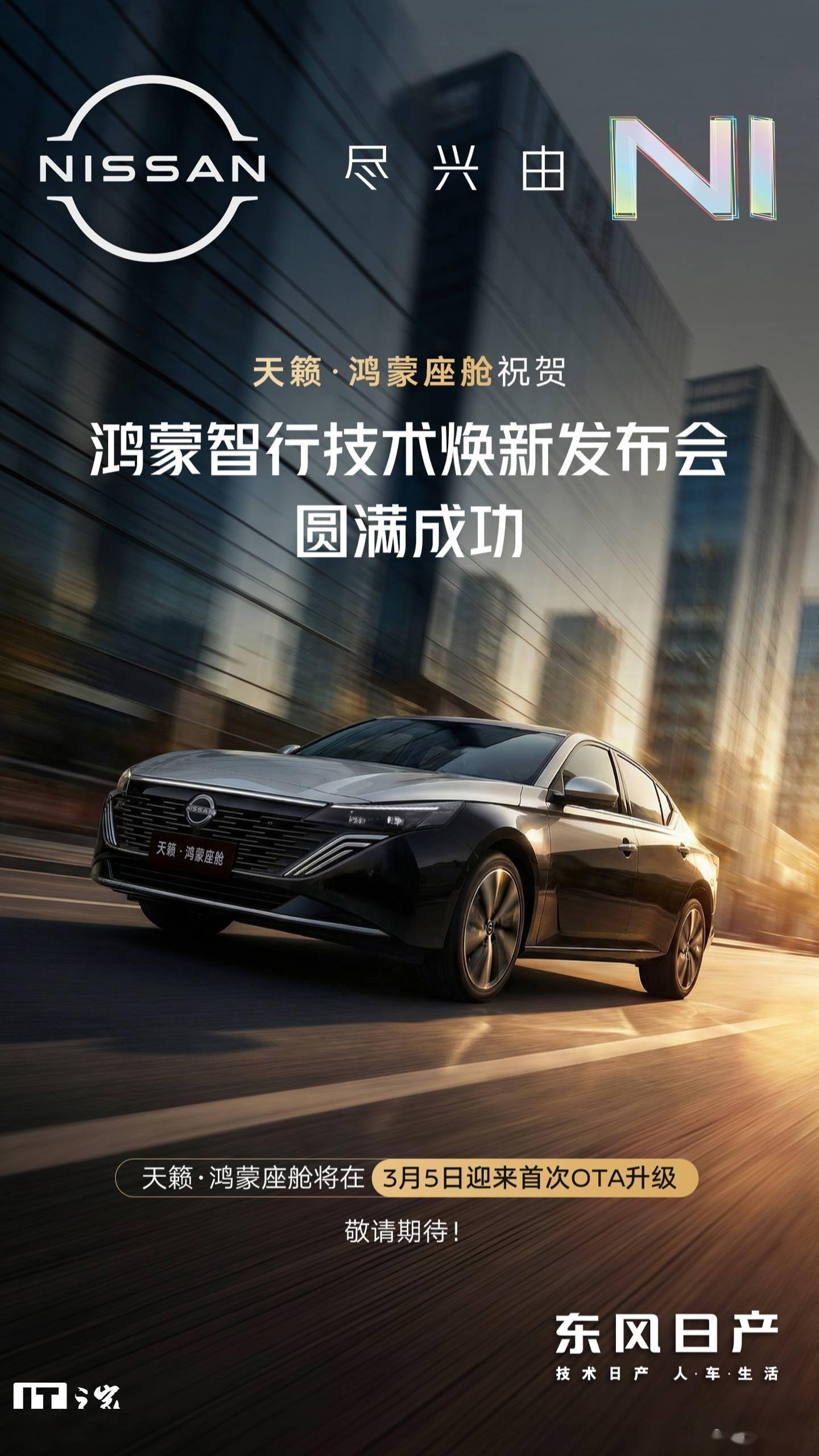 東風(fēng)日產(chǎn)天籟·鴻蒙座艙即將迎來(lái)首次OTA升級(jí)。根據(jù)官方消息,這款全球首款搭載鴻蒙座艙的燃油車(chē)型將于3月5日推送系統(tǒng)更新,此次升級(jí)恰逢鴻蒙智行技術(shù)煥新發(fā)布會(huì)后,引發(fā)市場(chǎng)對(duì)鴻蒙座艙新版本的期待。