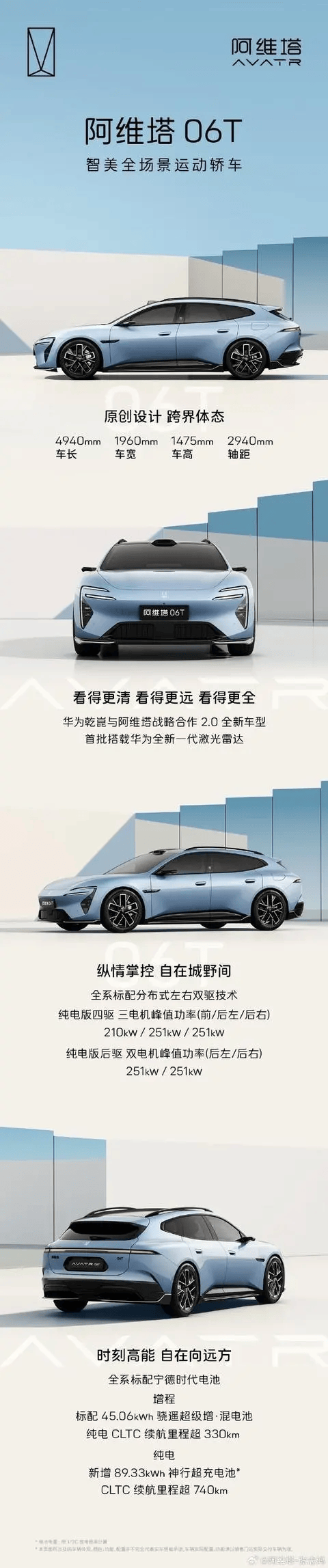 在動力性能領域,阿維塔06T展現出強勁的技術實力。純電版車型提供兩種驅動方案:四驅三電機版本采用前210kW、后雙電機各251kW的峰值功率組合;后驅雙電機版本則配備兩個峰值功率均為251kW的后置電機。這種差異化動力布局既滿足了運動操控需求,也為用戶提供了多樣化的選擇空間。