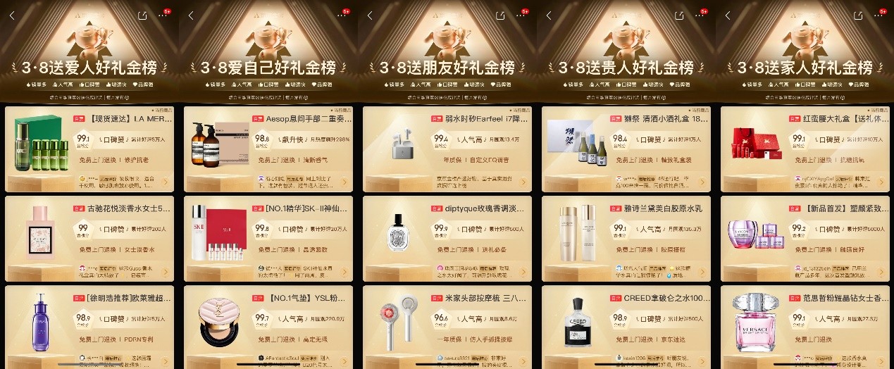 除了派送節日好禮,為了滿足3.8節期間消費者多元化的送禮需求,京東還基于平臺億萬消費者的真實購買數據,圍繞“送自己、送愛人、送家人、送朋友、送貴人”五大核心場景,推出“3.8犒勞老己好禮金榜”、“3·8送朋友好禮金榜”、“3·8送愛人好禮金榜”、“3·8送家人好禮金榜”、“3·8送貴人好禮金榜”五大榜單,從海量商品中精選出適配各個送禮場景的好物,幫助消費者精準鎖定禮物選擇,讓3.8節的每一份心意都能恰到好處。