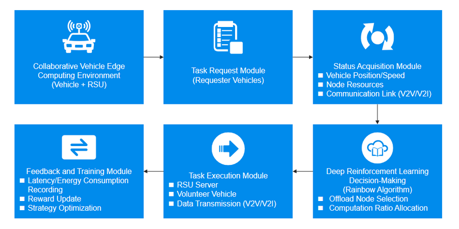 系統周期性收集環境狀態并輸入到Rainbow模型中,模型輸出當前最優的卸載策略。隨后,任務被分配到最合適的計算節點,并通過V2V或V2I鏈路進行數據傳輸。在任務完成后,系統會將延遲與能耗等反饋信息更新到經驗回放池中,并利用這些歷史經驗對Rainbow模型進行迭代優化,實現自適應的策略改進。