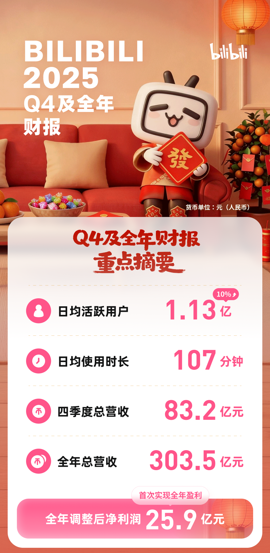 B站最新發布的財報數據顯示,公司在2025年實現了穩健的業績增長。全年總營收達到303.5億元人民幣,較上一年度增長13%,調整后凈利潤錄得25.9億元,成功實現全年盈利。其中第四季度表現尤為亮眼,營收規模突破83.2億元,同比增長8%,凈利潤增幅高達478%。