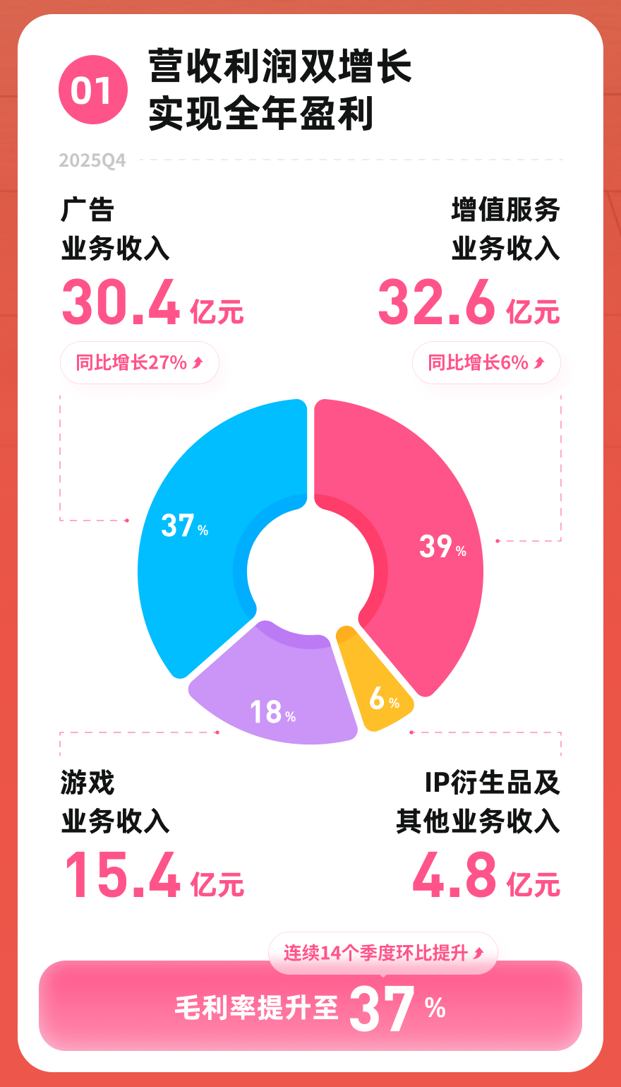 從季度表現來看,第四季度營收結構持續優化,各業務板塊協同發展。平臺通過精細化運營策略,在保持用戶規模增長的同時,有效提升了商業轉化效率,為全年盈利目標的實現奠定堅實基礎。這份財報不僅展現了B站在內容生態建設方面的成果,也反映出其在商業化道路上的持續突破。