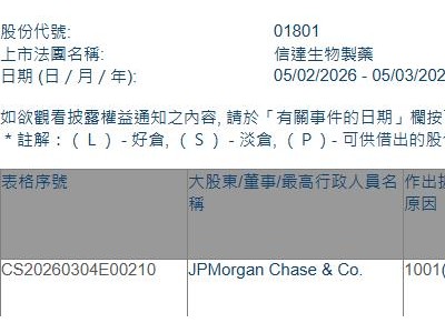 信達生物(01801.HK)獲摩根大通增持40.86萬股