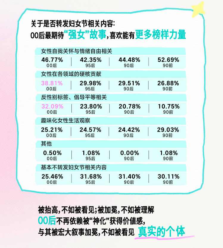 在成長路徑上,僅10.89%的受訪者保持高頻技能投資,多數(shù)人選擇根據(jù)自身階段進行節(jié)奏化規(guī)劃。她們并未回避競爭與進步,而是在現(xiàn)實條件與個人目標之間尋找平衡,強調(diào)穩(wěn)步推進而非盲目跟風。值得一提的是,調(diào)研數(shù)據(jù)顯示,00后最期待“強女”故事,期待能有更多榜樣力量。