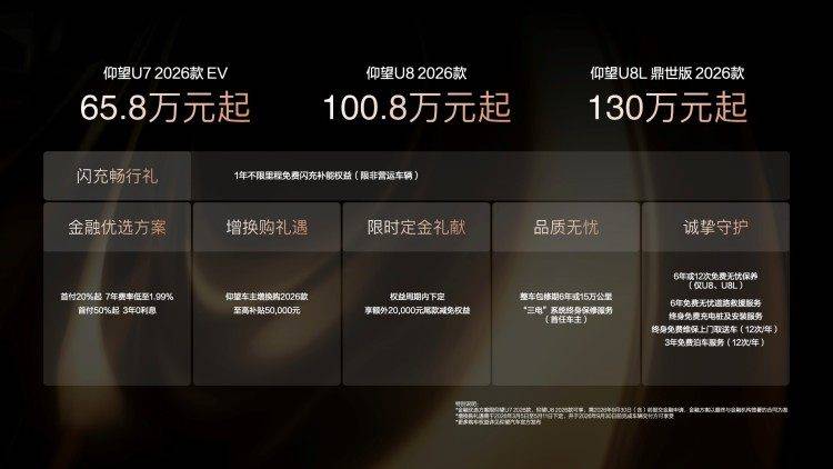 為了進一步提升用戶體驗,仰望汽車還推出了閃充暢行禮遇。在2026年5月11日(含)前支付2026款仰望車型定金的用戶,自交付之日起一年內,可在比亞迪閃充充電樁享受免費充電權益(限非營運車主)。這一舉措無疑為用戶提供了更加便捷和經濟的出行選擇。