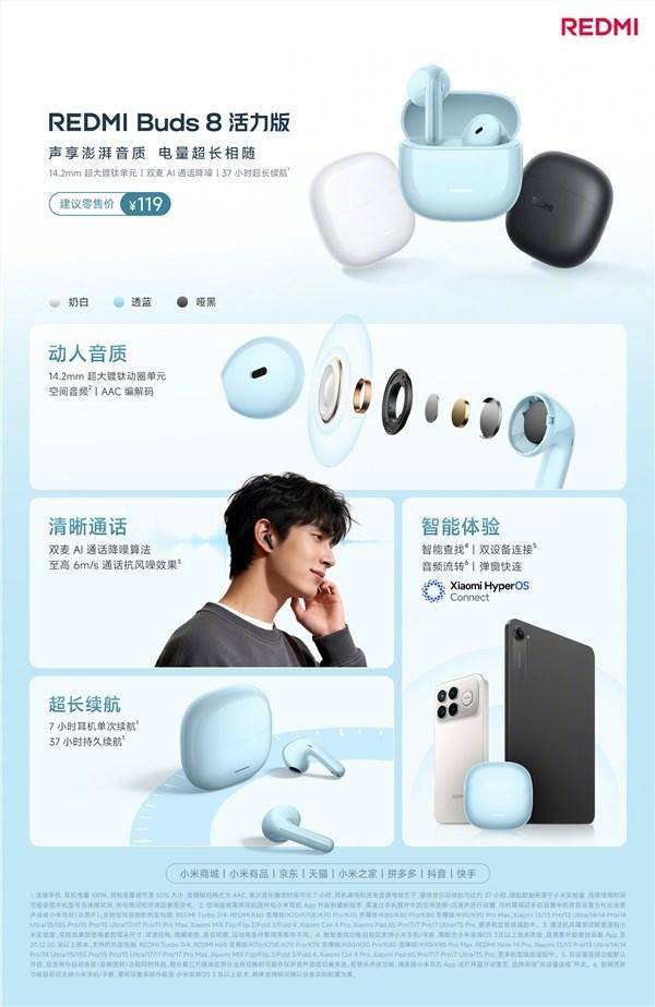 REDMI品牌近日推出了一款全新耳機——REDMI Buds8活力版,以119元的親民價格正式進入市場。這款耳機提供透藍、奶白、啞黑三種潮流配色,滿足年輕消費者對個性化的追求。