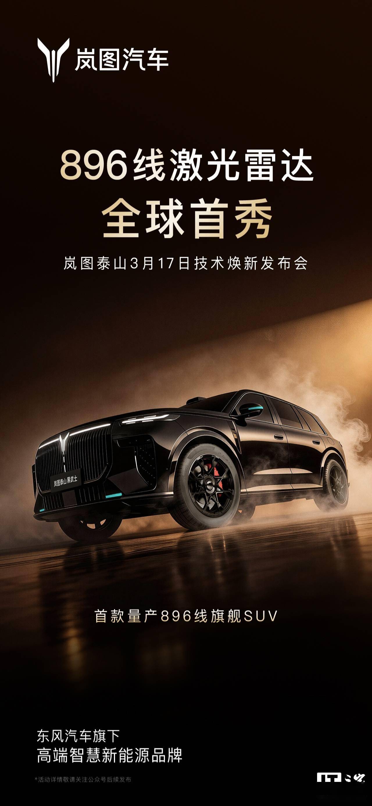 嵐圖汽車即將迎來一場技術盛宴。據悉,3月17日,嵐圖汽車將舉辦泰山技術煥新發布會——《遠見》,并在此次發布會上推出首款量產896線旗艦SUV——嵐圖泰山。