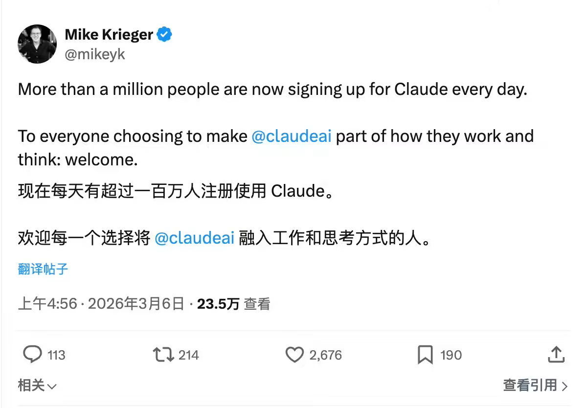 近日,人工智能領域傳來新動態,Anthropic公司高管邁克·克里格在社交平臺X上透露,其旗下AI聊天機器人Claude的每日新增用戶量已突破100萬大關。克里格于2024年加入Anthropic,起初擔任產品負責人,如今負責該公司新成立的實驗部門。