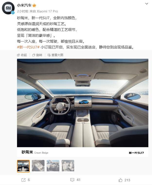 小米汽車近日正式推出新一代SU7車型,其中最引人注目的變化是內飾新增了“砂陶米”配色。這一設計靈感源自傳統砂陶工藝,通過低飽和度的暖色調與精細工藝的結合,營造出簡約而不失奢華的車內氛圍,為消費者帶來全新的視覺體驗。