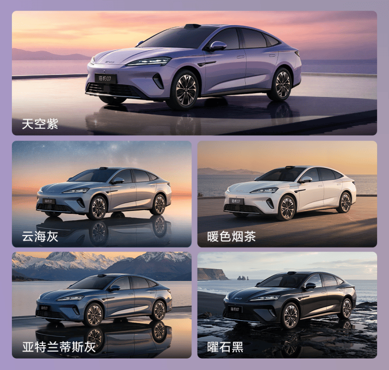 外觀設計延續海洋美學理念,推出"天空紫"、"云海灰"、"暖色煙茶"、"曜石黑"、"亞特蘭蒂斯灰"五種車身配色。車身尺寸為4995×1910×1495毫米,軸距2900毫米,定位中大型純電轎車。車機系統搭載DiLink 150智能座艙高階版,采用全新UI交互界面,集成全場景智能語音、手車互聯、車載K歌及萌寵動態主題等功能。