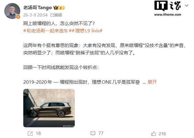 理想汽車產(chǎn)品線負責(zé)人湯靖近日在社交媒體發(fā)文,針對增程電動汽車技術(shù)近年來的輿論轉(zhuǎn)向展開深度探討,并透露理想第三代增程系統(tǒng)將隨L9 Livis車型于今年二季度正式上市。他以“曾經(jīng)批評增程技術(shù)的人為何突然沉默”為切入點,引發(fā)行業(yè)對技術(shù)路線演變的重新思考。