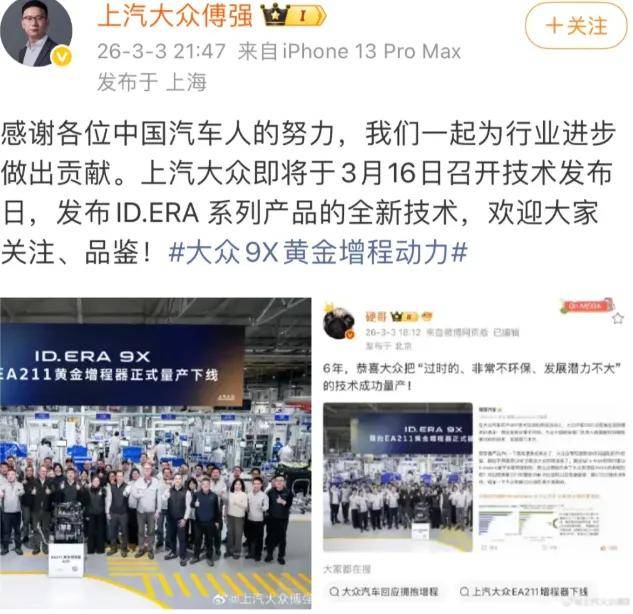 六年后,理想汽車憑借增程路線在市場站穩(wěn)腳跟,硬哥在近期公開調(diào)侃大眾“自我打臉”,引發(fā)網(wǎng)友熱議。有評論稱:“質(zhì)疑理想、模仿理想、成為理想,大眾恐成汽車界諾基亞。”面對這波輿論,大眾高管展現(xiàn)高情商回應(yīng):一方面感謝中國汽車人的努力,強調(diào)技術(shù)需服務(wù)于用戶體驗;另一方面宣布上汽大眾將于3月16日舉辦技術(shù)發(fā)布日,推出ID.ERA系列全新技術(shù)。這一回應(yīng)既化解了尷尬,又為新品發(fā)布造勢,被業(yè)內(nèi)評價為“大氣且智慧”。