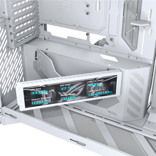 ROG幻世神機箱還配備了9.2英寸LCD屏幕模組,為玩家?guī)砹饲八从械慕换ンw驗。通過這塊屏幕,玩家可以實時掌握硬件狀態(tài)信息,如CPU溫度、風扇轉速等,一目了然,方便快捷。更為重要的是,屏幕支持自定義內容展示,玩家可以根據(jù)個人喜好自由設置圖片、視頻或動態(tài)效果,充分展現(xiàn)自己的個性與創(chuàng)意。無論是展示自己喜愛的游戲角色、動漫形象,還是獨特的藝術作品,都能讓機箱成為獨一無二的存在。