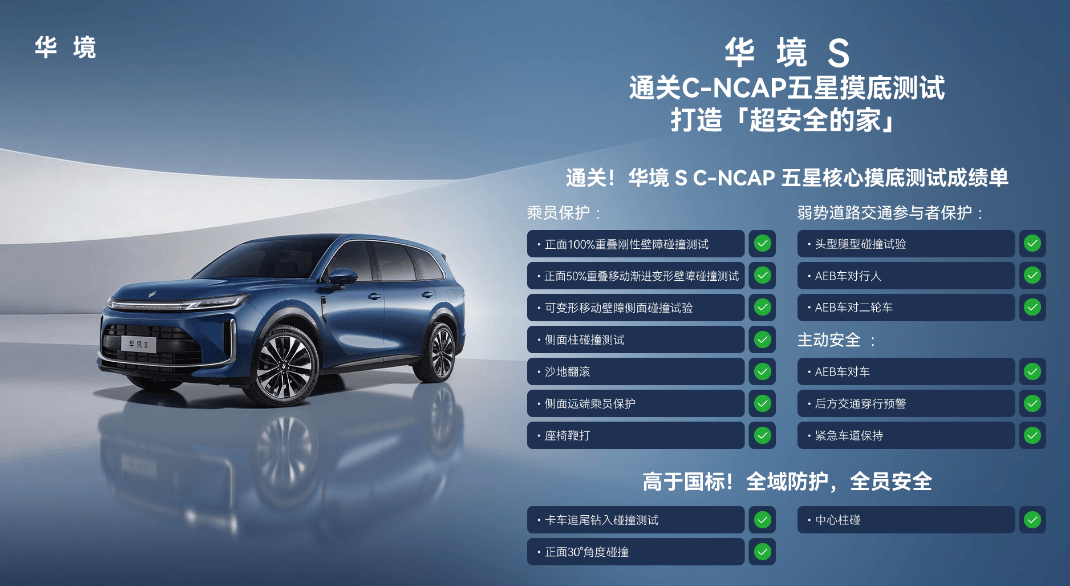 在乘員保護(hù)測試中,華境S經(jīng)歷了正面100%剛性碰撞、正面50%重疊碰撞(相對速度100km/h)、側(cè)面碰撞及側(cè)面柱碰等高強(qiáng)度考驗(yàn)。碰撞后,車輛駕駛艙結(jié)構(gòu)保持完整,車門可正常開啟,E-call緊急呼叫系統(tǒng)自動激活,為乘員爭取黃金救援時間。這些數(shù)據(jù)充分證明,華境S在被動安全設(shè)計(jì)上達(dá)到行業(yè)領(lǐng)先水平,能夠有效抵御極端碰撞場景對乘員的傷害。