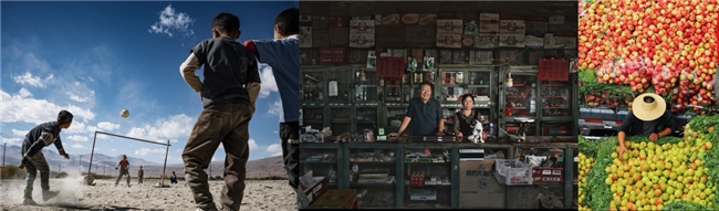 銀獎作品則呈現出更廣闊的地理與文化視角。《帕爾米高原的足球少年》捕捉高原上少年馳騁的動感瞬間,展現堅韌生命力;《鄉村供銷社》以紀實質感還原鄉村生活場景,傳遞時代變遷中的人情溫度;《豐收的蘋果攤》則以飽滿色彩與構圖,渲染出農產品豐收的喜悅氛圍。三者共同構建起從高原到村落、從個體到群體的影像敘事譜系。