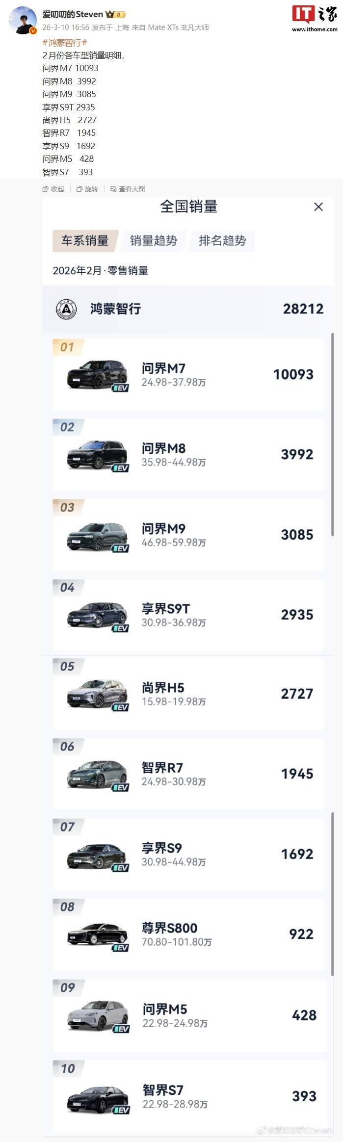 此前,鴻蒙智行曾對外宣布,2026年2月整體交付量達到28212輛,同比增長31%,歷史累計交付量更是突破了128.2萬輛大關。這一成績不僅彰顯了鴻蒙智行在新能源汽車市場的強勁勢頭,也為其后續(xù)發(fā)展奠定了堅實基礎。值得一提的是,享界汽車也在次日公布了其2月交付數(shù)據(jù),達到4627臺,進一步豐富了市場信息。