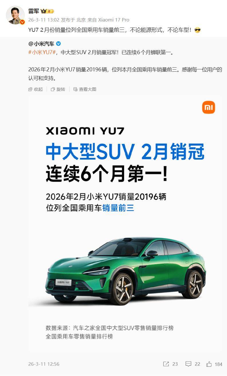 小米汽車近日公布了最新銷售數據,旗下YU7車型在2026年2月實現銷量20196輛,躋身全國乘用車市場銷量前三。這一成績不僅涵蓋所有能源類型車型,更使YU7連續六個月蟬聯中大型SUV細分市場銷量冠軍。根據官方披露,小米汽車當月整體交付量突破兩萬輛大關。