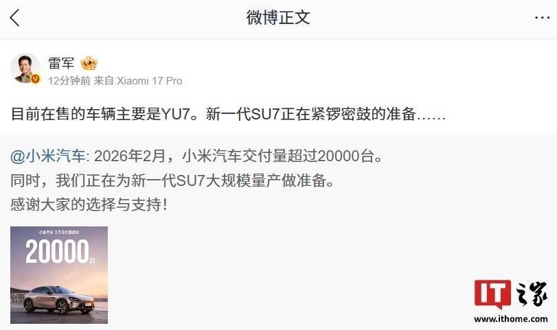 小米集團董事長雷軍通過社交平臺透露,當前在售車型以YU7為主力。他同時分享了1月銷售數據,顯示該車型單月銷量達37869臺,推動小米汽車整體交付量突破39000臺。這一表現印證了小米汽車在新能源市場的快速崛起勢頭。
