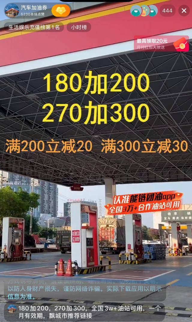 國內成品油價格迎來年內最大幅度上調后,短視頻平臺上涌現出大量以“加油優惠”為賣點的直播間。某直播間主推的“180元團200元”“270元團300元”加油代金券,僅兩款產品累計銷量已接近10萬單,月銷售額突破2500萬元,甚至登上平臺“生活娛樂充值榜”榜首。然而,這些看似誘人的優惠背后,卻暗藏諸多消費陷阱。
