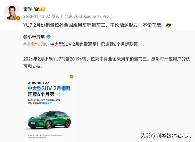 在新能源汽車市場競爭愈發(fā)激烈的背景下,小米汽車憑借旗下兩款主力車型的出色表現(xiàn),迅速躋身行業(yè)頭部陣營。最新數(shù)據(jù)顯示,小米YU7在2月以20196輛的銷量成績,成功闖入全國乘用車銷量前三,并連續(xù)六個月蟬聯(lián)中大型SUV細分市場冠軍。這一成績不僅刷新了小米汽車自身的銷量紀錄,更成為純電車型在主流乘用車市場崛起的重要標志。