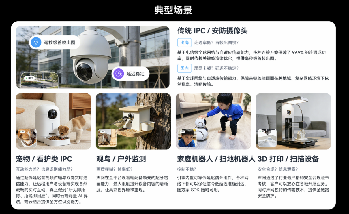 針對物聯網設備的連接痛點,聲網同步推出的泛IPC解決方案提供四大核心能力:依托自研SD-RTN?網絡實現的全球覆蓋,確保東南亞等網絡薄弱地區設備激活成功率超99.9%;專利編解碼算法在80%丟包環境下仍保持流暢傳輸;端云協同AI架構支持寵物檢測、行為分析等場景算法的云端加載;多端互通技術突破傳統P2P方案的人數限制,同時滿足全球合規要求。這些能力組合,精準解決了攝像頭、掃地機器人等設備的實時交互難題。