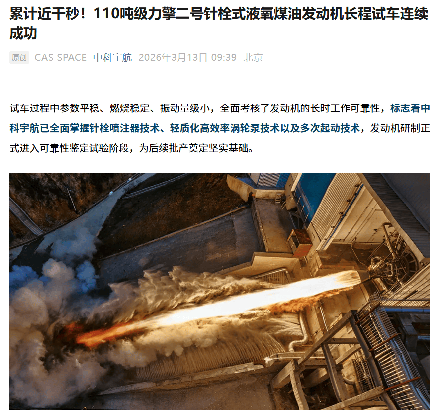 中科宇航力擎二號發動機長程試車連捷 累計近千秒助力可回收火箭研發
