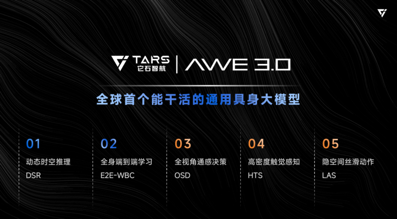 今日它石發布的全球首個能干活的通用具身大模型AWE3.0,以“走出溫室、落地干活、通用泛化”的能力,實現了流暢的毫米級精度操作、柔性物體感知控制、長程任務穩定執行等方面的性能提升和跨場景遷移泛化的突破。