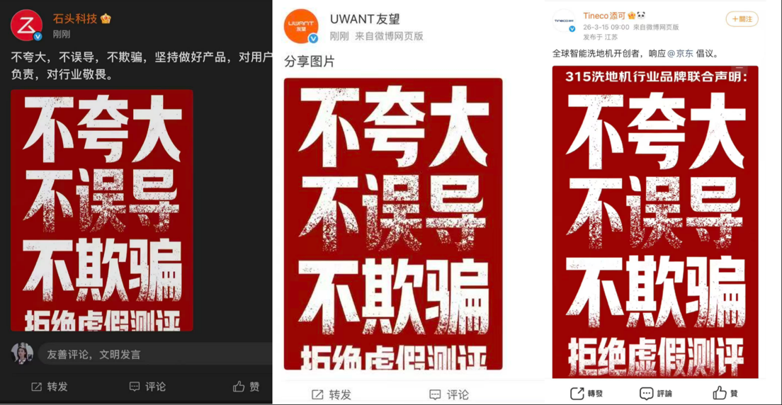 事實上,在近日的2026年AWE展會期間,京東就已聯合云鯨、添可、追覓、uwant等多家洗地機品牌,在現場揭穿部分直播機構通過“技術處理”制造性能假象的操作方式,共同發聲抵制虛假測評對行業生態的侵蝕。多位品牌負責人更是隔空怒斥虛假直播間。云鯨品牌負責人當場直言:“我們兩三年研發出的科技成果,被這些虛假直播間用十幾秒就‘否定’了,這不僅是對品牌投入的不尊重,更是在誤導消費者。如果今天不站出來發聲,消費者就可能一直被蒙在鼓里。” 還有品牌負責人表示,一些直播間會通過人為干預產品結構、堵塞吸污口等方式制造性能下滑假象,這種做法根本不是客觀測評,而是在刻意“變魔術”。