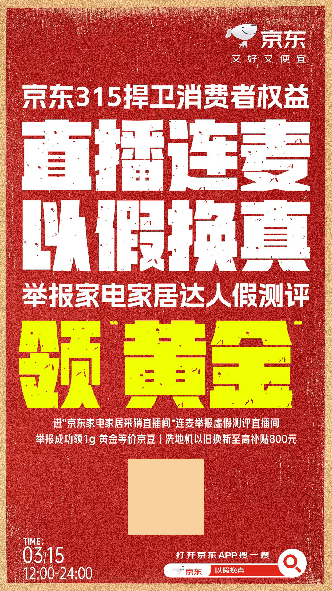 同時,京東也將治理動作進一步延伸到消費者權益保障層面。3月15日當天,如用戶發現虛假測評行為,或曾遭遇虛假測評誤導,可上京東搜索“以假換真”,申請在直播間連麥,提供相關虛假測評達人姓名及詳細線索;經核實有效后,京東采銷會向線索提供者獎勵價值1克黃金的京豆。同時,京東用至高800元的大額以舊換新補貼,降低消費者的換新成本。