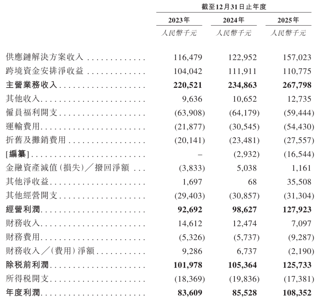 財務數據顯示,2023至2025年間,企業營收呈現穩步增長態勢,分別錄得2.21億元、2.35億元及2.68億元。同期經營利潤由9269萬元增至1.28億元,凈利潤則從8361萬元提升至1.08億元,展現出較強的盈利韌性。值得注意的是,2024年供應鏈解決方案貢獻1.57億元收入,跨境資金服務則帶來1.1億元凈收益,形成雙輪驅動的業務結構。