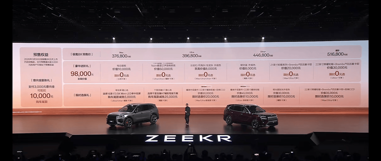 極氪品牌全新中大型SUV——極氪8X正式開啟預售,此次共推出Max版、Ultra版、Ultra+版及曜影版四款車型,預售價區間為37.68萬元至51.68萬元。作為極氪家族的旗艦級產品,新車以"低趴巨獸"的設計語言和多項行業首創技術引發市場關注。