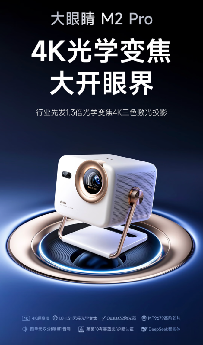 Vidda大眼睛M2 Pro作為行業首款1.3倍光學變焦三色激光4K投影儀,完美解決了小空間大畫面的難題。無論是都市公寓的臥室還是書房,都能輕松投射百寸巨幕。其搭載的萬元級MT9679芯片和四單元雙分頻HIFI音響系統,讓每一次觀影都如同置身專業影院。6月4日-6日限時搶購,疊加國家補貼后僅需3679元,還贈送EPP便攜收納箱和視頻VIP月卡,更有機會抽中1099元幕布。對于追求品質生活的用戶,無疑是打造私人影院的最佳選擇。