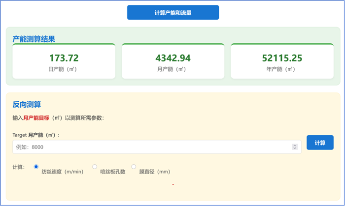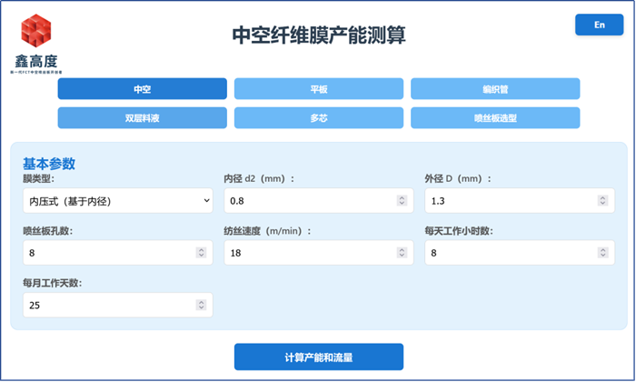 用戶輸入中空纖維膜的內徑、外徑、孔數,或平板膜的寬度、涂覆厚度,結合紡絲速度、班時與工作日等要素,系統可自動計算日產能、月產能與年產能。這一過程替代了傳統的手動逐項估算,有助于減少計算環節的誤差累積。