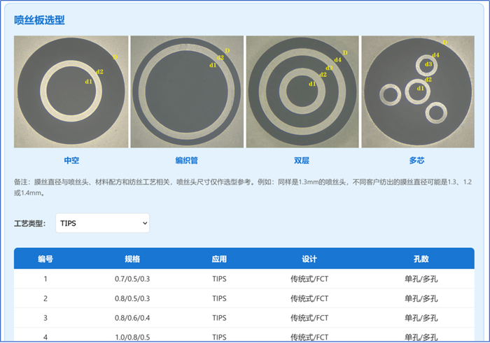 工具內收錄了NIPS、TIPS、雙層料液復合膜、編織管涂覆膜及多芯濾膜等常用噴絲頭/噴絲板的規格信息,覆蓋210余種規格尺寸選項。對研發階段的方案對比,或是對特定工藝的預研選型,這一模塊提供了可橫向比對的基礎參數。