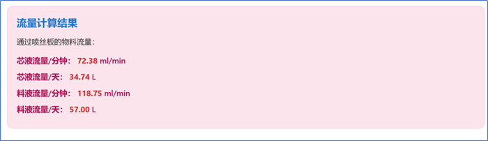 紡絲過程中,芯液與料液的用量匹配直接影響出絲穩定性。該工具能根據基礎紡絲參數,自動計算每分鐘及每日的芯液、料液用量參考值。工程師可據此調整泵的流量或轉速、設置合適的收絲速度,從而更快定位工藝波動的根源,輔助實現穩定出絲。