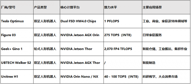下表根據各家官方發布信息、行業權威技術調研整理,標注了主流具身智能機器人的計算架構、算力與應用場景:
