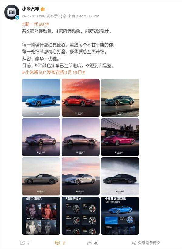 在車身色彩方案上,新車提供多達9種選擇,其中卡布里藍、赤霞紅、靛石綠三款為全新專屬配色,其余6種配色延續(xù)經(jīng)典設(shè)計。這種"新老結(jié)合"的配色策略,既滿足年輕群體對個性化的追求,也兼顧了傳統(tǒng)用戶的審美習(xí)慣。特別值得一提的是,SU7 Max版卡布里藍車型推出專屬定制服務(wù),消費者可額外選裝20英寸鋒刃輪轂特別版、暗黑主題內(nèi)飾等個性化配置。