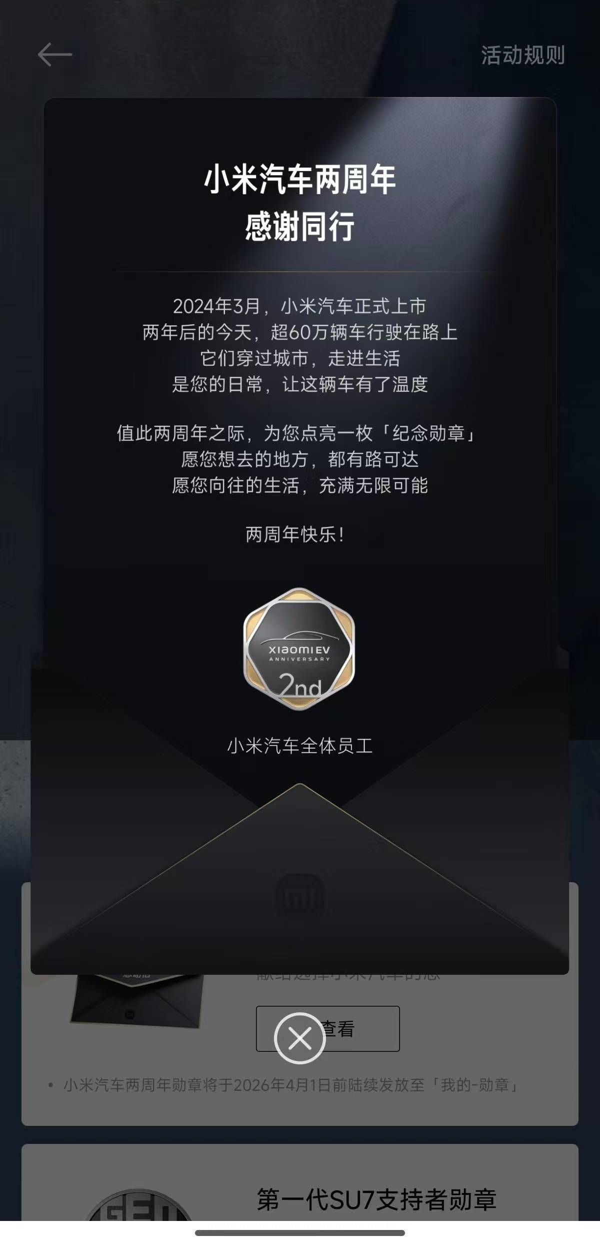 除了冰箱貼外,小米汽車還為車主們準備了一份特別的紀念——點亮了一枚“紀念勛章”,以此慶祝小米汽車上市兩周年的重要時刻。這一舉措不僅增強了車主的歸屬感,也體現了小米汽車對用戶的關懷與重視。