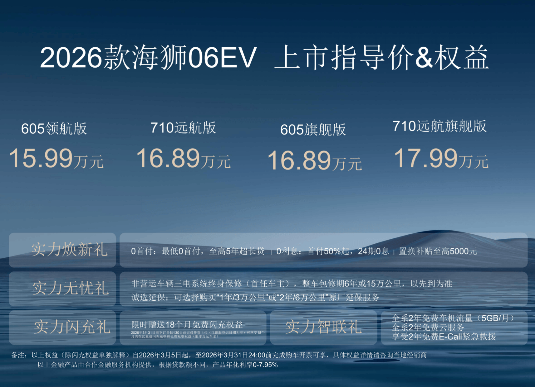 作為海洋網首款搭載全新閃充技術的量產車型,2026款海獅06EV以"上市即交付"的魄力,將前沿科技轉化為觸手可及的出行體驗。該車型在常溫環境下實現9分鐘從10%充至97%的極速補能,即便在零下30℃的極端氣候下,充電效率依然保持行業領先水平。全系最高710km續航里程配合170項標配功能,從智能駕駛輔助到移動起居室般的舒享配置,全方位滿足精英家庭對品質出行的期待。其新增的TBC高速爆胎穩行系統,可在140km/h時速下將車輛偏移控制在0.75米內,為安全出行構筑最后一道防線。