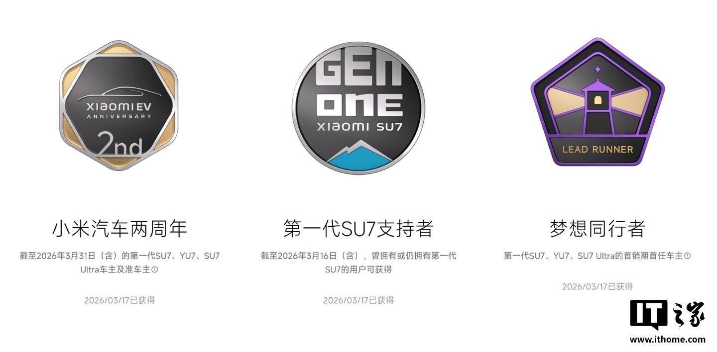 虛擬勛章體系分為三類:其一,“小米汽車兩周年紀念勛章”面向本月底前購買SU7、YU7或SU7 Ultra車型的用戶(含已訂車準車主);其二,“第一代SU7支持者勛章”專屬于所有曾購買初代SU7的車主;其三,“夢想同行者勛章”僅授予初代SU7、YU7及SU7 Ultra首銷期的首任車主。用戶可通過小米汽車App直接領取對應勛章,無需額外操作。