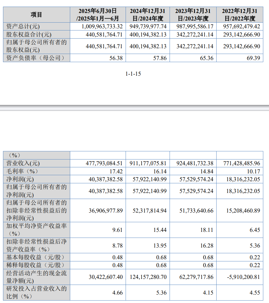 從財務表現來看,安達股份在報告期內(2022年至2025年上半年)展現出穩健的增長態勢。2022年至2023年,公司營業收入從7.71億元增至9.24億元,2024年雖略有回落至9.11億元,但仍保持在高位;凈利潤則持續攀升,從1831.62萬元增至5792.21萬元,即使在營收回調的2024年,凈利潤仍實現穩步提升。公司經營活動現金流凈額由負轉正并持續擴大,反映出財務健康度的顯著改善。
