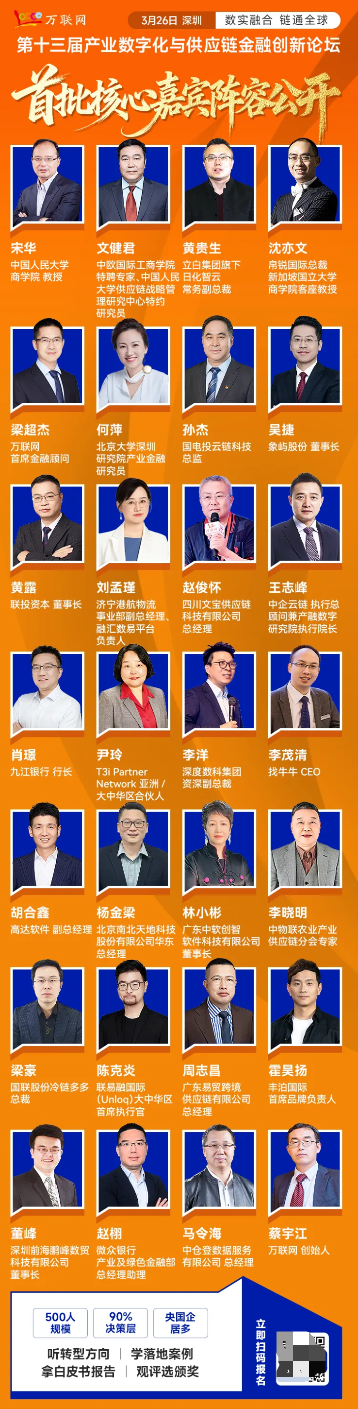 本次產(chǎn)業(yè)數(shù)字化與供應(yīng)鏈金融創(chuàng)新論壇即將迎來第十三屆,由萬聯(lián)網(wǎng)主辦,并獲得中企云鏈、深度數(shù)科、找牛牛科技、高達(dá)軟件、南北軟件、中軟創(chuàng)智、海爾鑫海匯、享宇科技、金網(wǎng)絡(luò)等合作伙伴大力支持,以及中國人民大學(xué)中國供應(yīng)鏈戰(zhàn)略管理研究中心、萬聯(lián)供應(yīng)鏈新質(zhì)發(fā)展智庫等鼎力支持,將于2026年3月26日在深圳盛大召開!