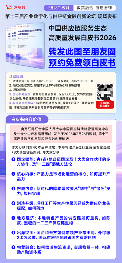 看點(diǎn):發(fā)布萬聯(lián)網(wǎng)和中國人民大學(xué)中國供應(yīng)鏈戰(zhàn)略管理研究中心聯(lián)合編制的《中國供應(yīng)鏈服務(wù)及產(chǎn)融調(diào)查報(bào)告2026》