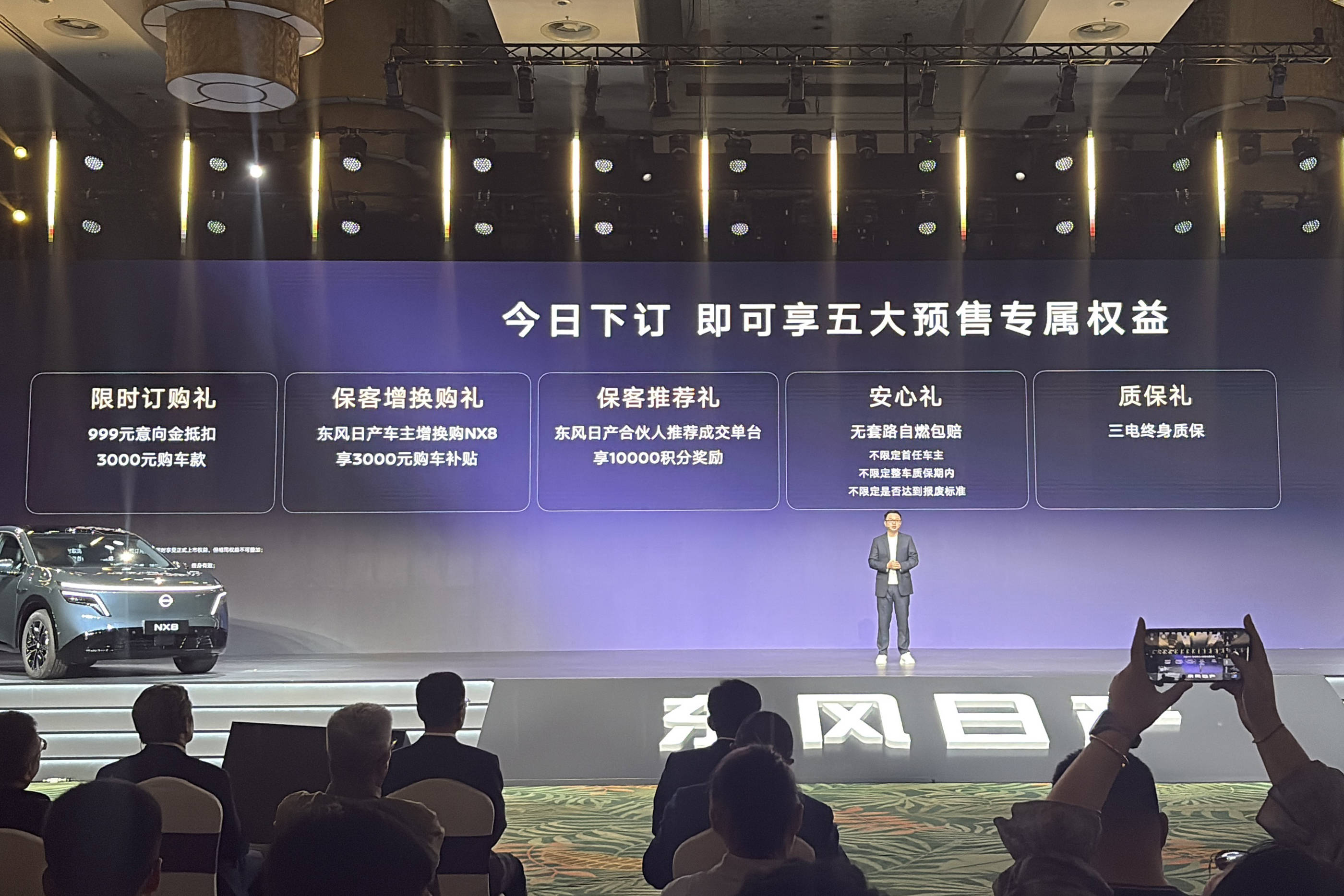 智能駕駛領域,NX8搭載激光雷達,支持高速領航輔助NOA、城市領航輔助NOA及全場景智能輔助泊車功能,為用戶提供更安全、便捷的駕駛體驗。預售期間,東風日產推出五大專屬權益,包括999元意向金抵扣3000元購車款、車主增換購補貼3000元、合伙人推薦獎勵10000積分、無套路自燃包賠及三電終身質保,進一步降低購車門檻。官方表示,NX8將以產品實力說話,暫不公布預售價以避免市場試探。